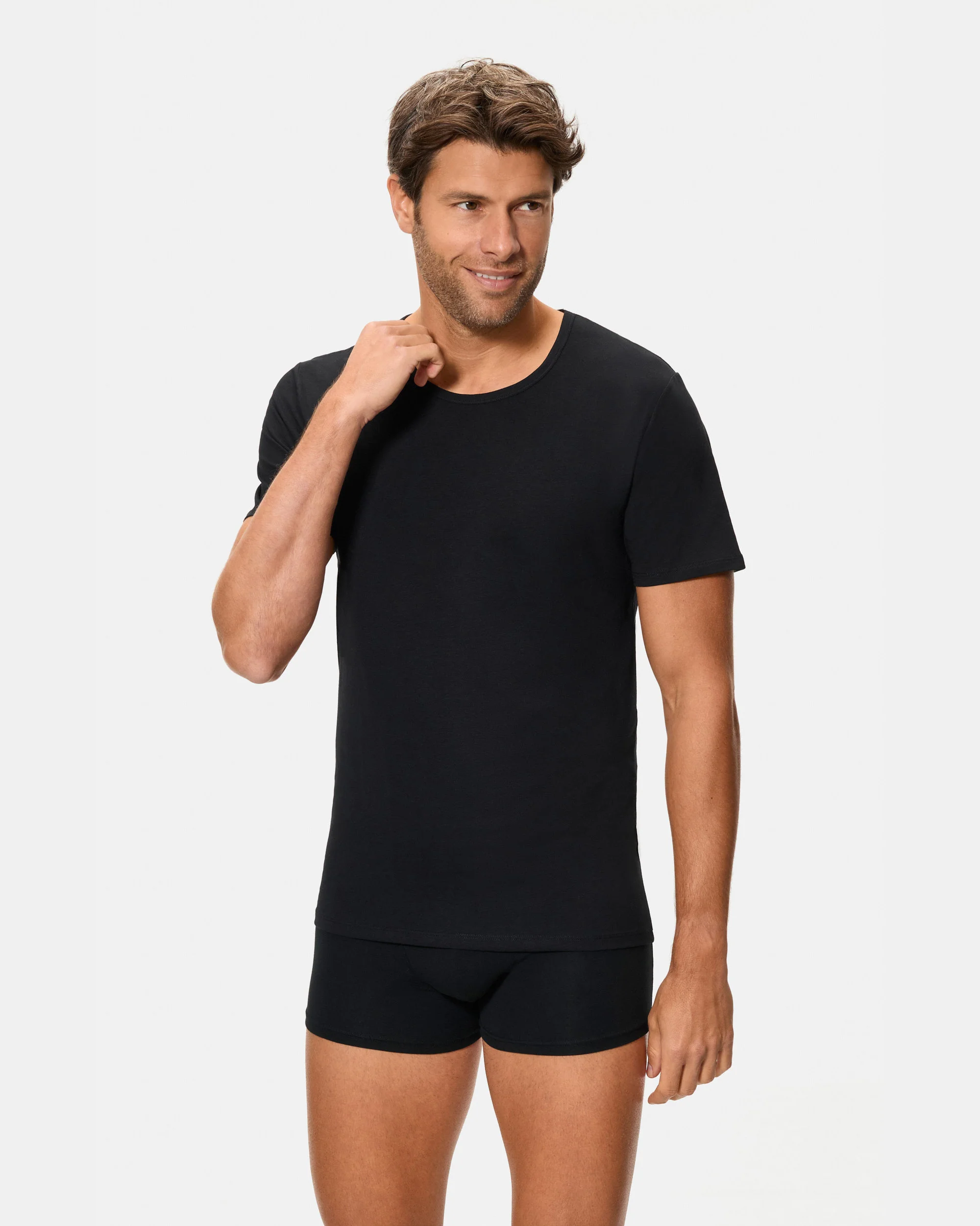 Camiseta de manga corta negra para hombre con cuello redondo, fabricada con la tecnología termorreguladora Regul'activ. Esta tecnología optimiza la distribución del sudor y acelera la evaporación de la humedad, activándose automáticamente cuando la temperatura corporal varía. Con su algodón elástico, se adapta al cuerpo como una segunda piel, proporcionándote confort y frescura durante todo el día.