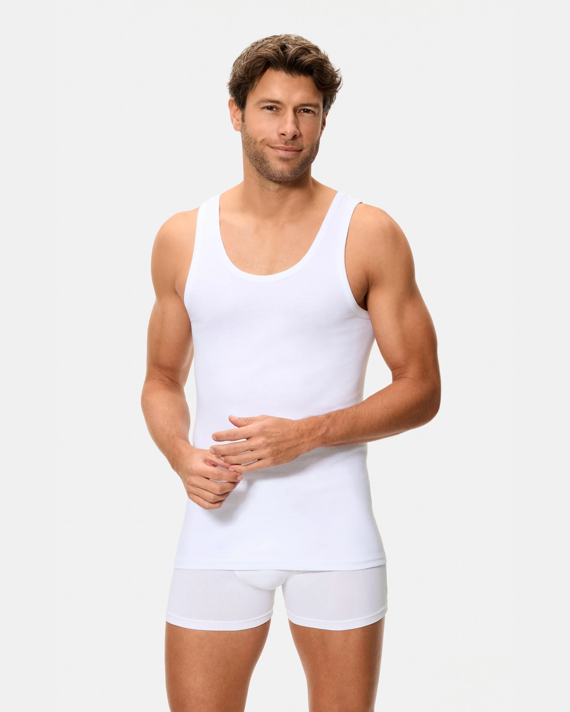 Pack de 2 camisetas de tirantes blancas para hombre, confeccionadas en algodón 100% de alta calidad y tejido canalé 1x1. Este pack ofrece una comodidad excepcional y transpirabilidad, con un ajuste perfecto al cuerpo. Ideal para usar como prenda interior o para actividades cotidianas. Cada camiseta está diseñada para brindarte confort durante todo el día, adaptándose a tu cuerpo como una segunda piel.