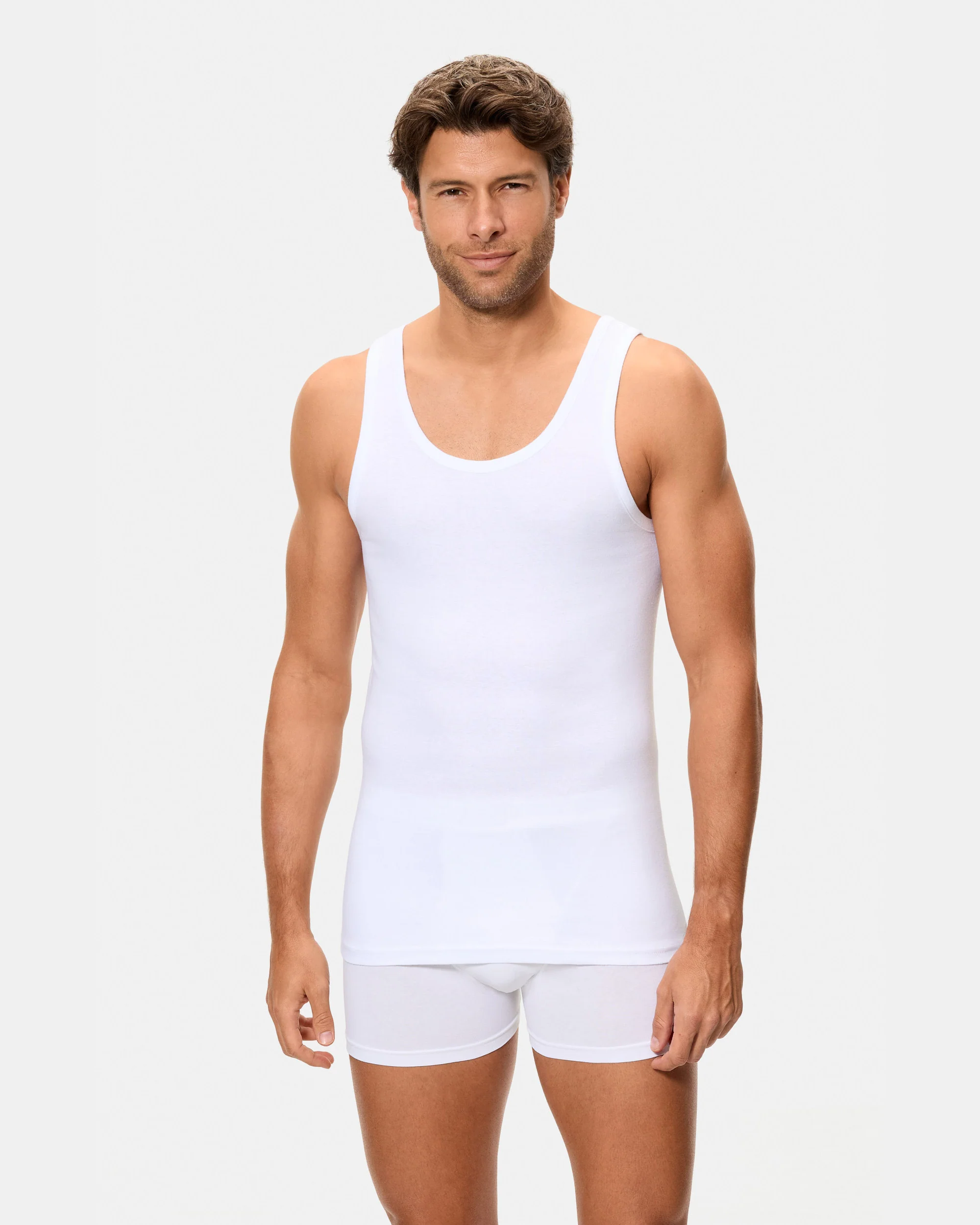 Pack de 4 camisetas de tirantes blancas para hombre, confeccionadas en algodón 100% de alta calidad y tejido canalé 1x1. Este pack ofrece comodidad, transpirabilidad y un ajuste perfecto al cuerpo. Ideal para usar como prenda interior o para actividades cotidianas. Cada camiseta está diseñada para brindarte confort durante todo el día, adaptándose a tu cuerpo como una segunda piel.